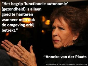 De kern van het gedachtegoed van Anneke van der Plaats is haar strijd voor de functionele autonomie van ouderen met een langdurige ziekte zoals Alzheimer-dementie. De kern is NIET omgevingszorg gericht op de fysieke omgeving, dat is ‘slechts’ een aanvullend onderdeel van de beoogde functionele autonomie. Anneke: “Het begrip ‘functionele autonomie’ is alleen goed te hanteren wanneer men ook de omgeving erbij betrekt.”