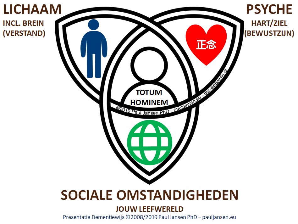Ook Anneke is van mening dat elk van de drie genoemde ‘werelden’ uit het model hierboven elkaar voortduren beïnvloeden en de volledige, unieke mens vormen (zie ook http://dementiewijs.nl/de-wondere-wereld-van-de-mens/). Daar heeft Prof. Anne-Mei The, grote fan van het oorspronkelijke gedachtegoed van Anneke, alles van begrepen en zij is daar al jaren positief mee aan de slag gegaan met haar verhoogde aandacht voor met name de sociale wereld van mensen met dementie (zie: http://www.anne-meithe.nl/sociale-benadering-dementie.html).